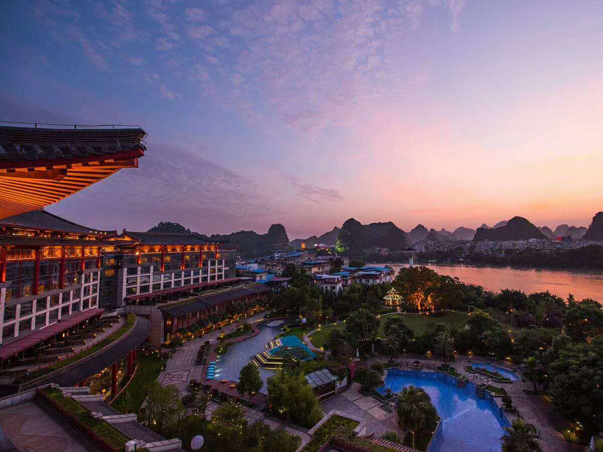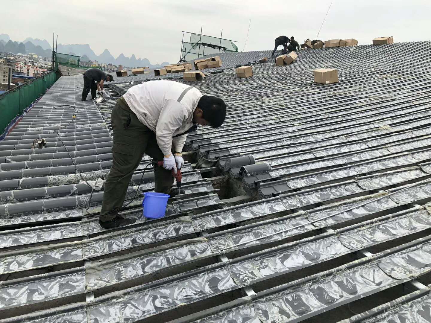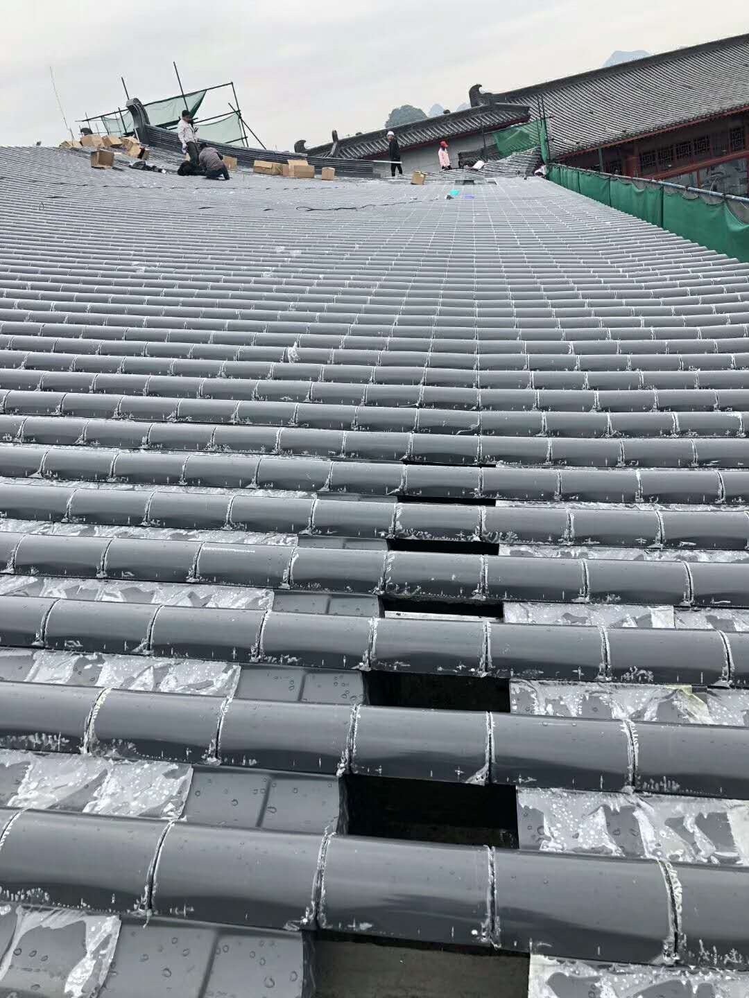 桂林山水甲天下,桂林香格里拉酒店屋面換瓦工程由東申瓦業(yè)供瓦,選擇鋁瓦代替已損壞,部分漏水的陶土瓦,為最明智的選擇,金屬仿古瓦,屋面工程約一萬平米;
