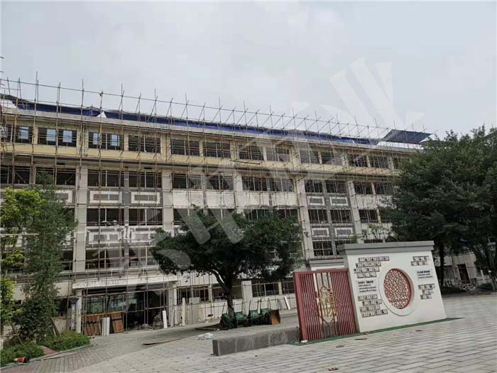 成都外國語學校屋面改造,使用東申仿古鋁瓦-連體瓦;共計2800平方,15天快速完工,中式仿古屋面,彰顯校園集聚古文化氣息.