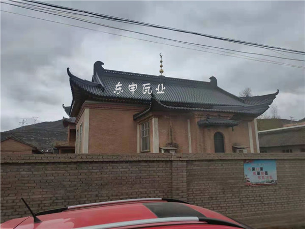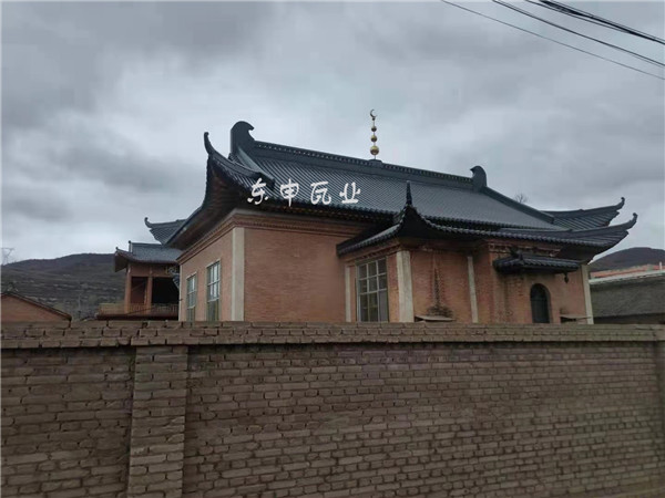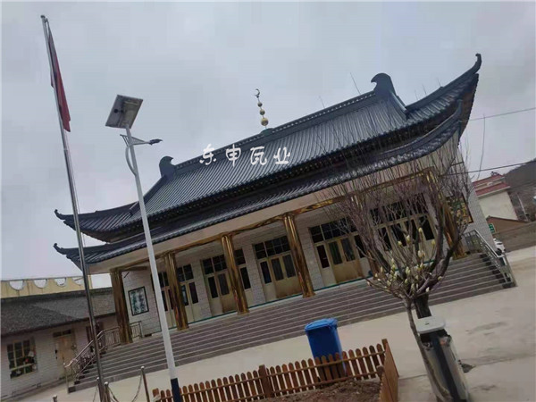 甘肅閆家清真寺屋面改造成新中式風格,屋面面積約610平方米,采用3號分體瓦,厚度1.2mm,顏色選擇中灰色,材料為鋁合金金屬材料,寺院采用壽命達百年不用維護和修繕屋面;