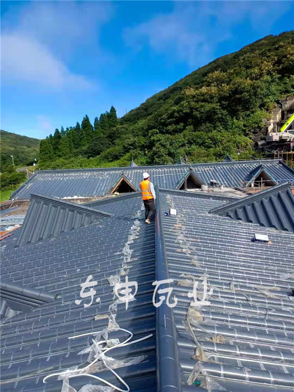 重慶金佛山假日酒店屋面鋁瓦工程收尾中,主要采用東申瓦業生產的2號連體鋁瓦,顏色:灰色;中式仿古風格;整體屋面面積約3800多平方米;感謝重慶金佛山工程項目部各位領導的信任和支持;