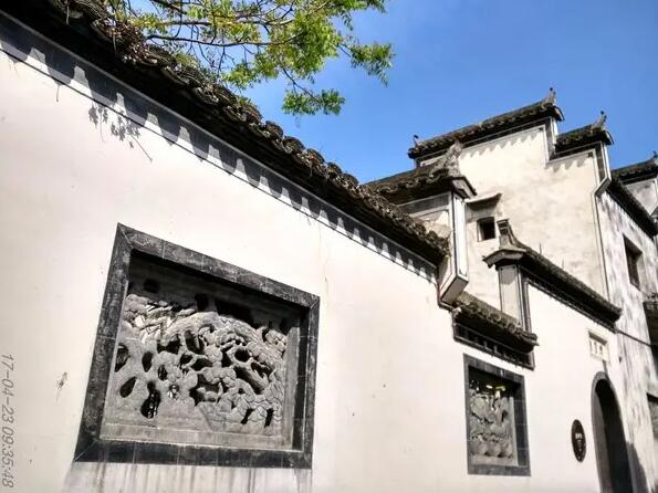 徽派建筑還廣泛采用磚、木、石雕,表現出高超的裝飾藝術水平。磚雕大多鑲嵌在門罩、窗楣、照壁上,在大塊的青磚上雕刻著生動逼真的人物、蟲魚、花鳥及八寶、博古和幾何圖案,極富裝飾效果。木雕在古民居雕刻裝飾中占主要地位,表現在月梁頭上的線刻紋樣,平盤斗上的蓮花墩,屏門隔扇、窗扇和窗下掛板、樓層拱桿欄板及天井四周的望柱頭等。內容廣泛,多人物、山水、花草、鳥獸及八寶、博古。