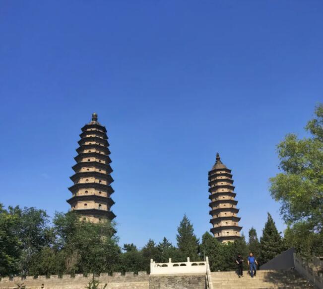 雙塔高均為54米,南北對峙,均用磚砌仿木構筑,與大雄寶殿結構一致。塔呈樓閣式梭形,隨著塔身的上升,每層高度逐漸降低,斗、拱由五踩重翹變為三踩單翹,符合人們仰視時下低上高的視覺。