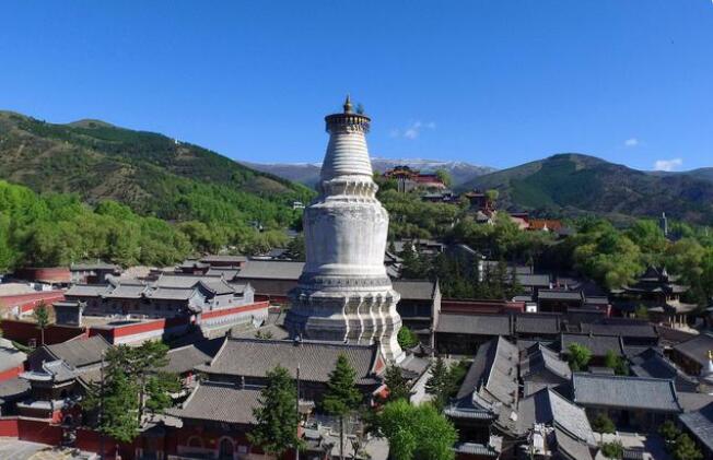 大白塔的全名為釋迦文佛真身舍利塔,座落在塔院寺內,塔基為正方形,環周83.3米,通高75.3米。寶塔通體潔白,塔身狀如藻瓶,從底到頂,精細相間,方圓搭配,造型優美。圓盤邊緣,還吊裝36瑰銅質垂檐,每塊長2米馀,寬近1米。各垂檐下端,又掛風鈴三個,連同塔腰風鈴在內,共有252個。
