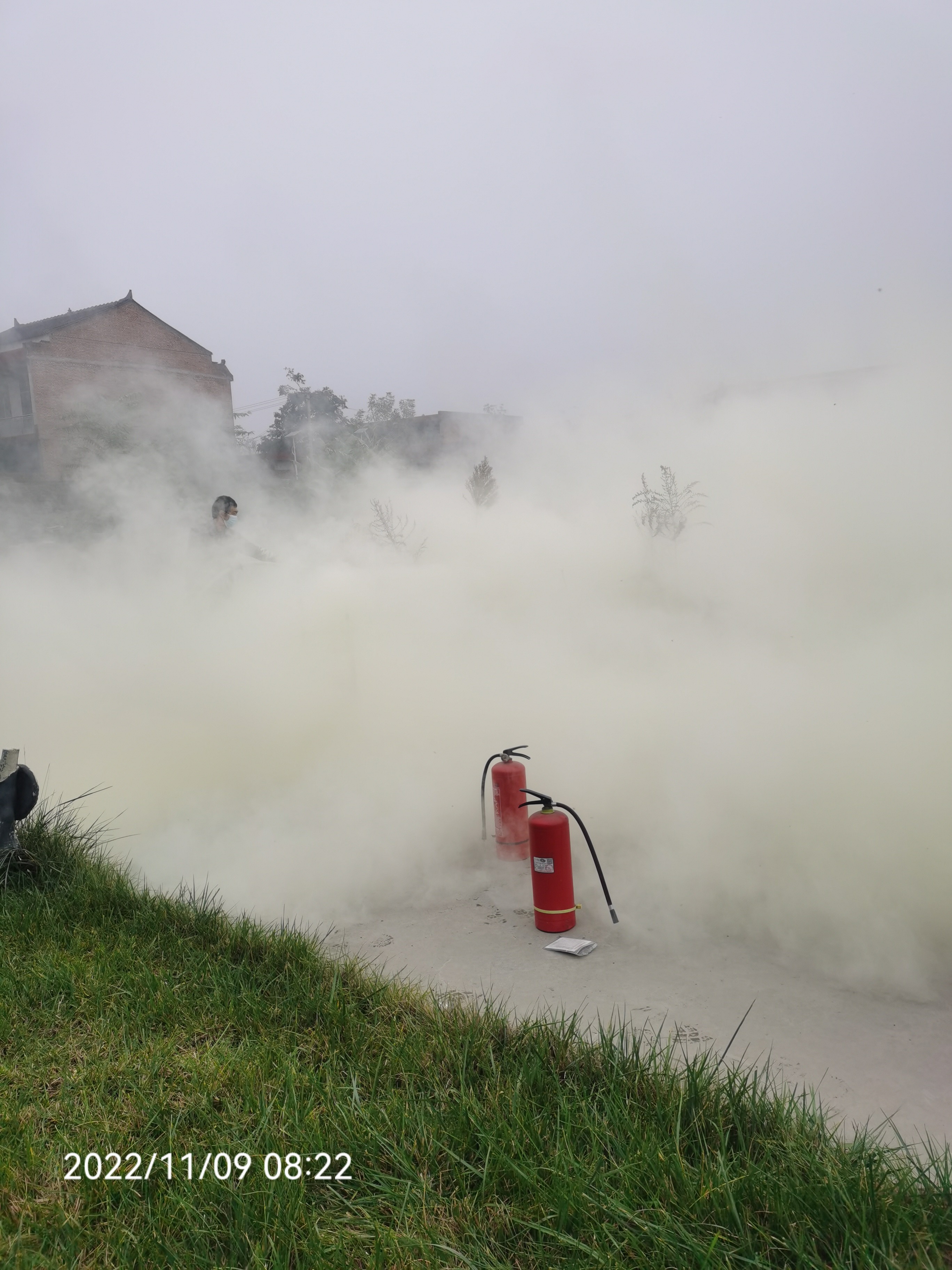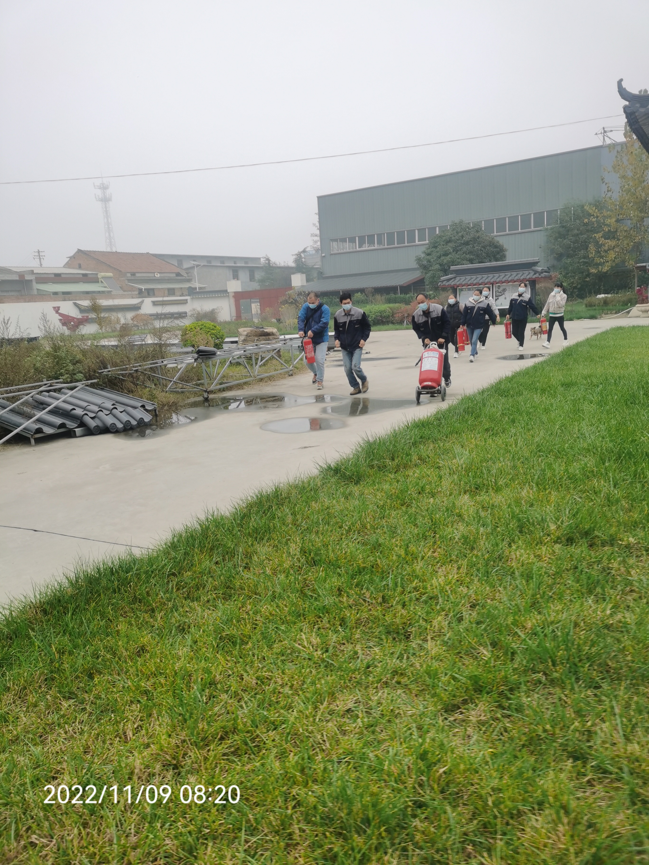 其次,大家搬運消防器材進廠區活動區域等候