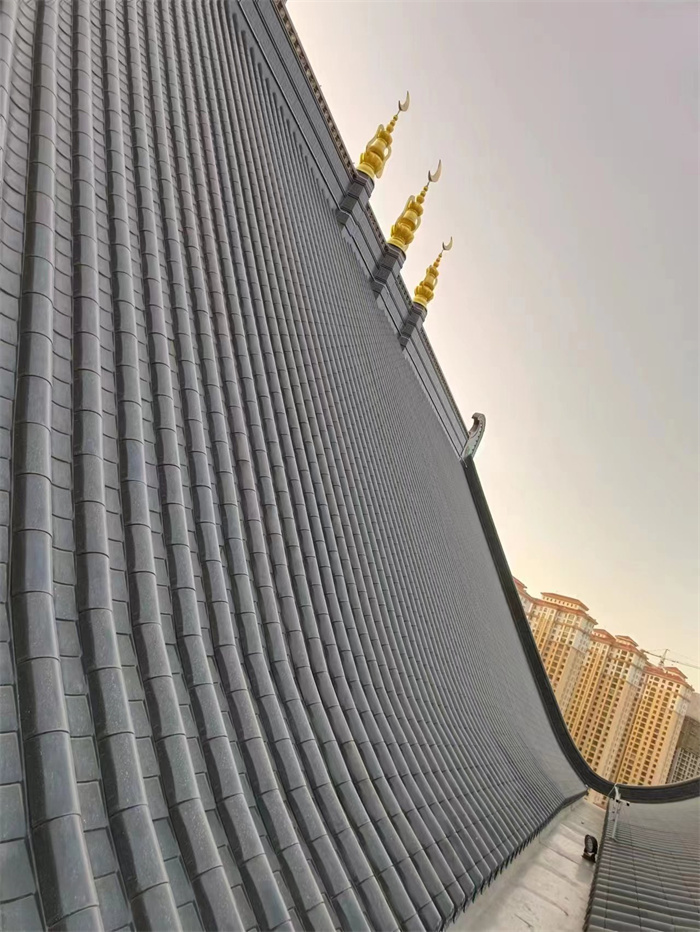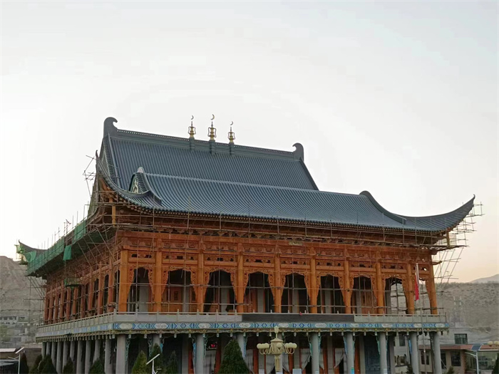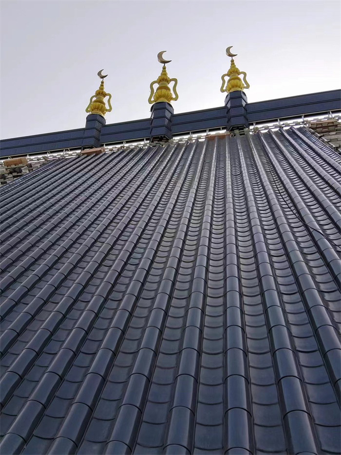 青海西寧民和南清真大寺屋面鋁瓦工程,選用東申瓦業,2號分體瓦,厚度:1.2mm;顏色灰色;面積約2600平方;風格為新中式仿古風格。