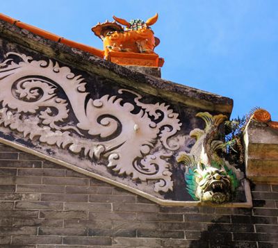 不僅中國宮殿里有這種滴水神獸,越南的順化皇城也毫不例外,在兩處屋頂的交接處,裝飾了一個巨大的龍形滴水神獸,在滿足排水的功能外,在敬畏天地鬼神的年代,其辟邪壓勝的象征意義,還給居住者一種精神上的慰藉。