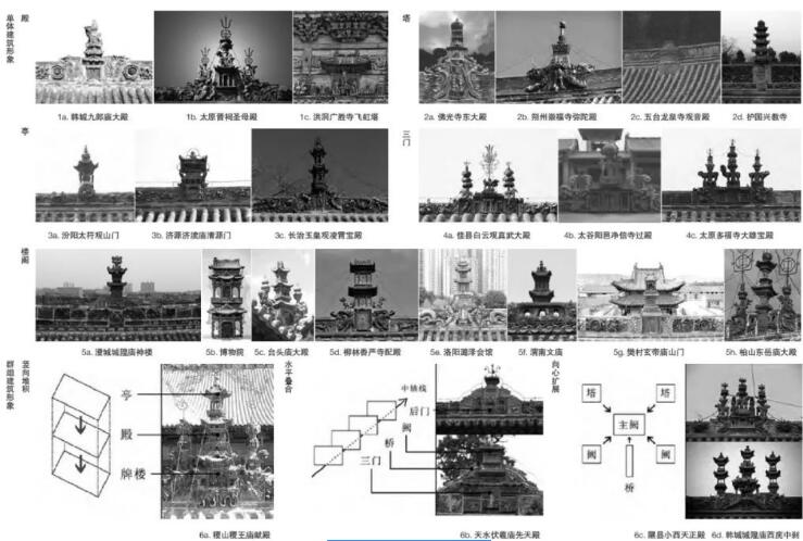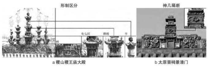 本文通過系統(tǒng)爬梳脊剎的樣式特征與變形機制,初步形成以下認識:1)晉陜豫黃河沿線的屋型脊剎作為一種“建筑模型”,寫仿建筑整體形象,卻于細節(jié)之處多有省略。通過對“部分”的圖解,從橫寬與縱高兩種比例控制入手,探明“部分”能夠表現(xiàn)“整體”的變形閾值,有助于理解古人意識中傳統(tǒng)建筑的顯性基因。2)屋型脊剎單元的組合邏輯有三:豎向堆積、水平疊合和向心擴展,與建筑群構成方式有異曲同工之處。加之其細節(jié)折射了在地的樣式與構造信息,對于探究營造傳統(tǒng)的變遷和審美風尚的轉移頗有助益。3)屋型脊剎作為一種捏塑燒制的藝術品,往往摻糅了關涉民俗和宗教的諸多要素(橋、牌額、蓮礎、神像等),反映了古人豐富的精神世界。這使其成為挖掘“仿木”現(xiàn)象背后文化觀念變遷歷程的優(yōu)質媒材。