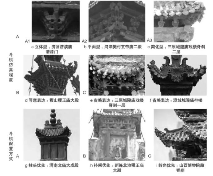 斗栱構件過于精細,捏塑時難以準確表現(xiàn),因而刻意淡化,按仿真度高低可分3類:1)真實表達(又分A1立體型,樣式與建筑所在地域往往有所關聯(lián);A2平面型,逐層前傾以示出跳;A3簡化型,僅在櫨斗內安置耍頭間接示意);2)寫意表達(體現(xiàn)為外出尖角/下昂的如意斗栱);C省略表達(以塊體疊澀或纏枝、蓮瓣等替代)。配置方式則分為:A柱頭鋪作優(yōu)先(無補間);B補間鋪作優(yōu)先(開間較局促時會省略兩平柱上鋪作);3)轉角鋪作優(yōu)先(往往將柱頭鋪作轉過45o充任,并未三向出跳)。顯然,斗栱配置方式多樣而刻畫難度較高,本身并非屋型脊剎的描畫重點(圖10)。