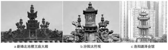 傳統(tǒng)建筑的屋脊裝飾,向來被視為反映特定地區(qū)和時期下民系審美意識的重要參照,其母題極盡豐富,既有以祥禽瑞獸仿生象形者,也不乏借吉祥符號祈福辟邪者。明清以降,脊剎樣式在不同地域顯著分化:官式建筑多不使用;江浙常以瓦片疊出寶瓶、花籃、法輪之類形象點綴;閩粵崇尚裝飾,喜在剪黏花脊上鋪陳戲曲故事,建筑褪為情節(jié)背景;而黃河中游則直接安放樓閣模型,營構神圣場域(圖1)。