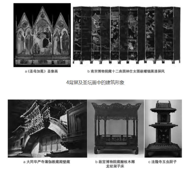 二維媒材的“建筑化”“模型化”裝飾趣味在中西方均廣泛存在,前者如背屏及圣壇畫中的建筑形象,后者則是對前者的邊緣加工。在壁畫、板畫內外融合建筑元素的手法自文藝復興起逐漸出現(xiàn)[15],目的是通過透視誘導在室內再造建筑層次以豐富空間感度[16],巫鴻說的“重屏”[17]其實也起到了相似效果(圖4)。繪畫中的建筑形象為觀者提供了錨定于此的文本背景,形成關聯(lián)于此敘事的超鏈接;對于畫框的“模型化”裝飾則進一步模糊了畫布與真實空間的邊界,通過將二維邊框三維化、建筑化,使之趨同于纈取建筑外觀的神龕帳座,塑造出“屋中屋”的復雜場域感。在中國,此類家具“建筑化”的傳統(tǒng)歷經了“結構的建筑化-形式的建筑化-建筑式家具-互動關系”4個階段后趨于完善[18],成為形式、結構、空間、功能兼?zhèn)涞摹敖ㄖP汀?圖5)。
