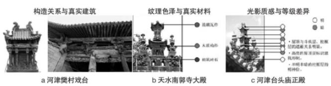 屋型脊剎帶來獨特的感知體驗。一方面,觀者自前一院落的門殿內遠望時,過白處理使之突兀于明、暗邊緣,天穹作幕日光剪邊,頗具神性之美;另一方面,屋型脊剎與其下建筑并置,混淆了縮微與真實尺度,對此“模型化”構件的觀察喚醒觀者的具身感知20)[16],誘導其依據人與建筑的經驗比例將自身意識縮小后投射其上,“神游”其中。觀者在觀察屋型脊剎的整體形象時,在分辨樣式細節(jié)、構造關系、紋理色澤、光影質感時,均不斷觸發(fā)特定感官體驗,進而于腦海中補繪出“天宮”圖景14[24](圖13)。物型比例與樣式細節(jié)持續(xù)刺激著觀者對日常建筑經驗的回憶,進而與“天宮”想象間建起虛擬關聯(lián),因此,恰當?shù)姆抡?細節(jié)豐度與變形程度)成為塑造屋型脊剎的核心議題,在其獨特的觀看距離與視角約束下,“酷肖”注定不是唯一訴求,對于“神似”效果的客觀解析才是重點。