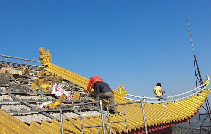 金屬瓦的安裝不同于傳統瓦,它是一個整體,底層打預埋后,上面焊接鍍鋅方管作為龍骨架;非常的結實;這是第一步;第二部裝瓦,金屬瓦的每一片瓦在生產時候,都有固定卡扣和與龍骨連接的點,直接使用鉚釘打上去的,幾乎每片瓦都打上去;避免了松動的可能,然后瓦與瓦的連接為一個扣一個,一次類推形成一個固定結實的整體固定在屋面;那么有人說了,那一陣風吹來也照樣掉揭開了,這個給大家說下,在我們瓦的前后,左右都有固定的封檐板和博風板;這樣完全擋住了一股大風的吹來引起的情況。基本風吹到封檐板和博風板上會形成一個反擊。