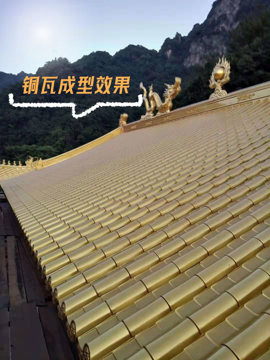 金屬銅瓦不同于傳統(tǒng)的陶瓦,琉璃瓦,樹脂瓦;單一從顏值上看,金屬銅瓦它紋理感和精細(xì)度更高;從表面看,金屬材質(zhì)的瓦,是通過沖壓成型的,在工藝上更精致一點(diǎn);從外面上看,屋面更高級(jí)。特別對(duì)于金色的瓦,表面的氟碳漆里面加了金粉,從遠(yuǎn)處看,就非常的金光燦燦;非常的美。