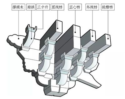 翹:形式與拱相同,方向與拱垂直;