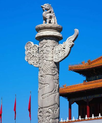 華表常建在重宮殿、陵墓等要建筑屋,主要入口的前端。似柱不是柱,似塔不是塔,是作為一種標識的附屬建筑,烘托建筑氛圍。相傳華表是部落時代的一種圖騰標志,古稱桓表,柱頂上有一承露盤,呈圓形,以此對應天圓地方。上面的蹲獸為傳說中的神獸朝天吼,或稱為望天犼,富有深厚的中國傳統文化內涵,“犼”是一種形似犬的瑞獸,根據所在方位的不同,表達的意義也不相同。天安門后面的一對華表上的石犼面朝北方,望著紫禁城,寓意是希望皇帝不要久居深宮不知人間疾苦,應該經常出宮體察民情,所以稱“望君出”。而天安門前面的一對石犼面朝南方,寓意皇帝不要久出不歸,故而稱“望君歸”。如此看來,這對華表也不單純是裝飾品而已,還是提醒古代帝王勤政為民的標志。