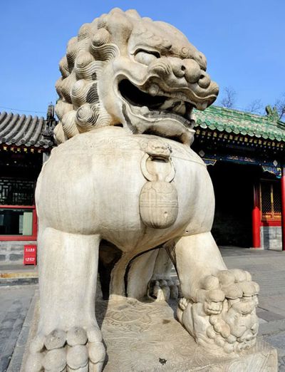 獅子,中國傳統文化瑞獸,在古建筑里極為常見。古人堅信其守門能辟邪。所以匠人在修建宮殿、陵墓、橋梁、府第及各類房屋建筑時,常常安放各式各樣的石獅子。古建筑大門外常左右成對擺放,依男左女右陰陽哲學,左雄右雌,既顯莊重威嚴,又寄美好祈愿,成古建筑關鍵文化符號。