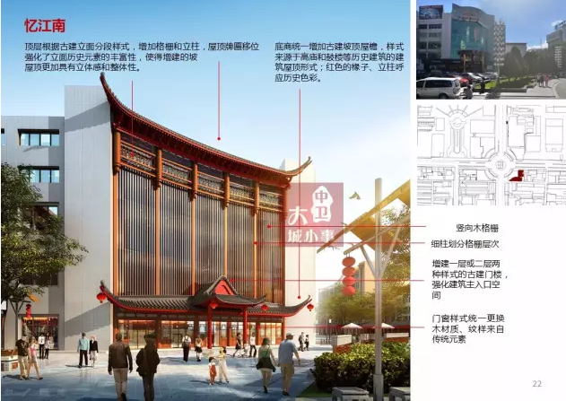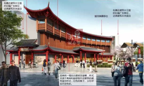 建設風格以明清古建筑風格為主,與高廟、鼓樓風格協調一致,打造歷史文化街區。改造范圍包括北到長城路、南至沙坡頭大道,東到文昌街、西至應理街的重要建筑、街道。一期重點對三片區(高廟公園核心區、紅太陽廣場片區、鼓樓片區)、五街道(鼓樓東西南北街、興隆北街共4300米)100棟建筑的外立面進行仿古改造。外立面提升改造主要在建筑沿街及側面、檐口強化明清古建筑風格,窗口玻璃幕墻增加古建筑符號,沿街適度增加古建廊道。